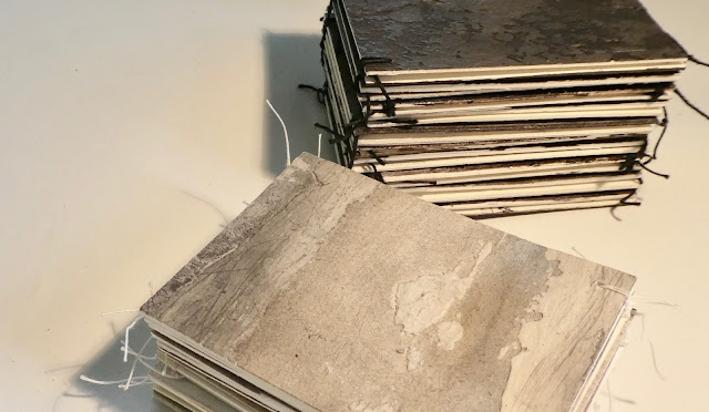 Well I for one am excited - and busy practising stitches, or variations thereof, which I haven't used for ages. I am out of practice taking photos while I work but I have just completed a small coptic binding with a header stitch which I undid three times before I was happy that I remembered it well enough to teach. I kept looking at a wonderful postcard Fiona Dempster made which reads ...